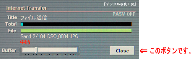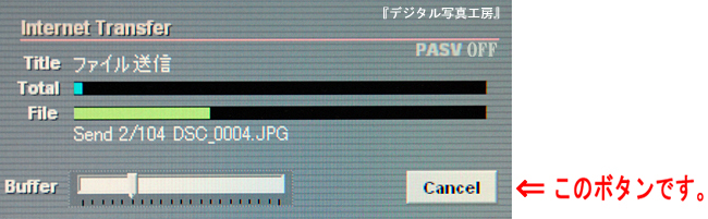 下記のように画像送信の途中で止まってしまった場合は、Cancel キャンセル ボタンをクリックしてください。